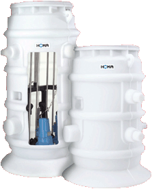 Anschlussfertige Kunststoff-Abwasserschächte oder monolithische Beton-Abwasserschächte für Tauchmotorpumpen zur Gebäudeentwässerung unterhalb der Kanal-Rückstauebene, für die Installation außerhalb von Gebäuden.
